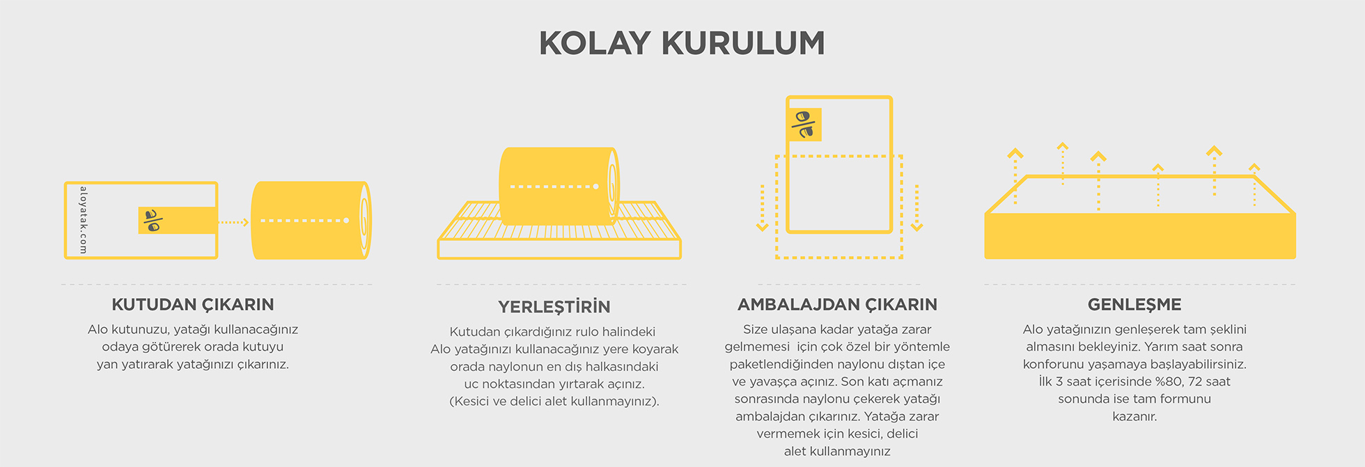 Olağanüstü sıkıştırılma ve genleşme özelliğiyle inovatif ambalajı, bize Alo yatağınızı kolaylıkla kapınıza kadar getirme fırsatı veriyor.